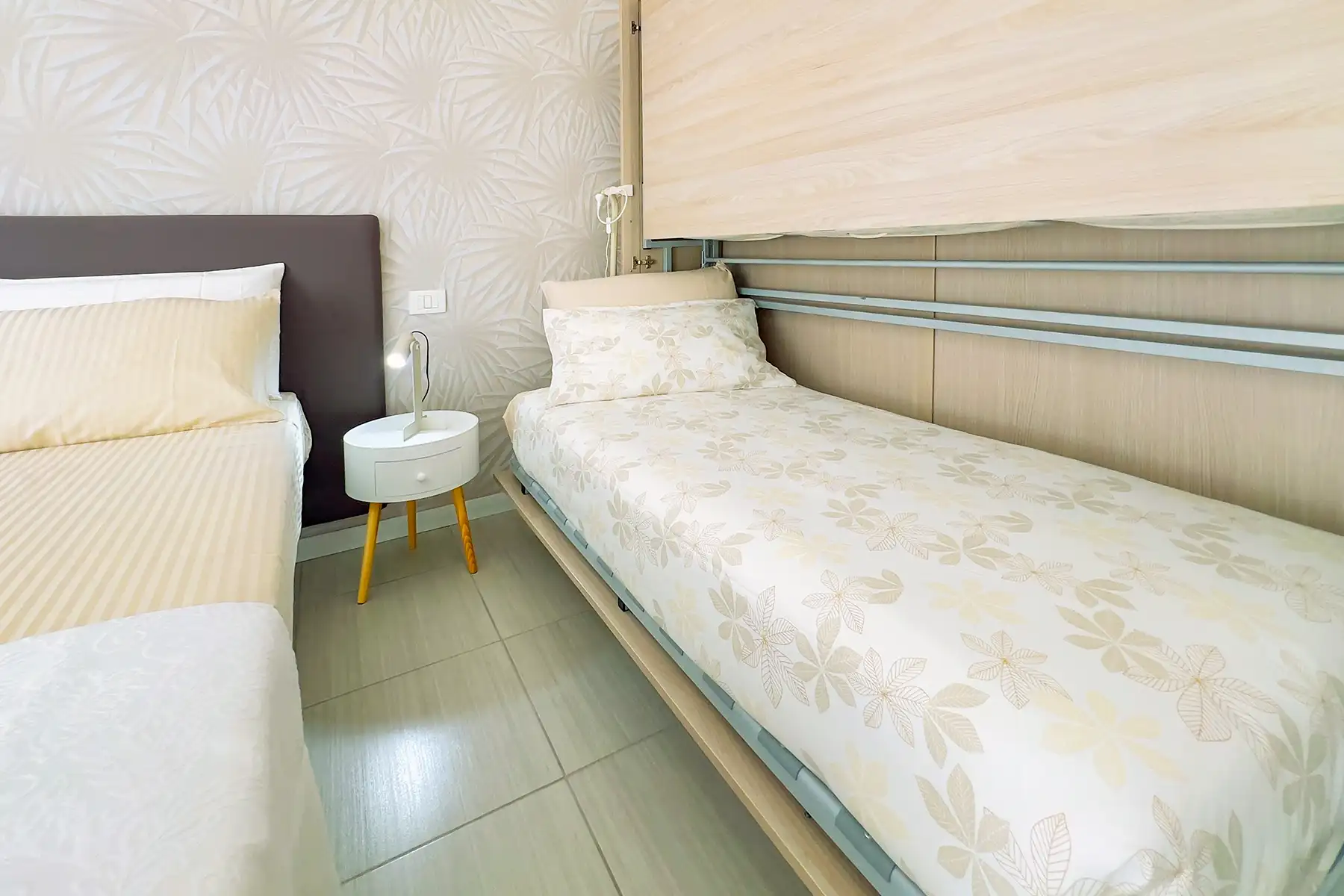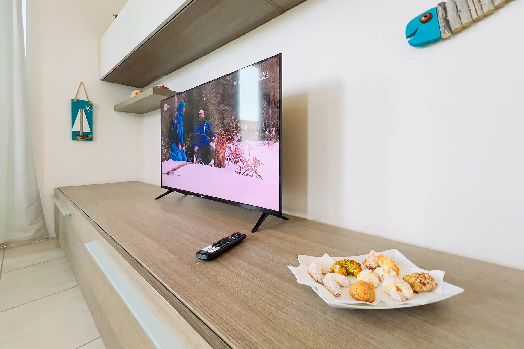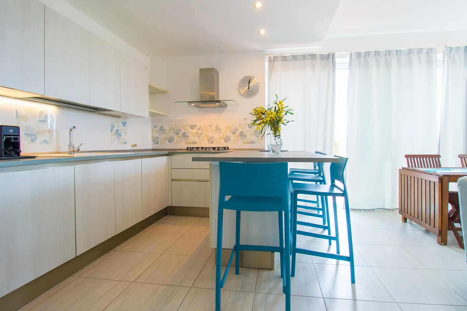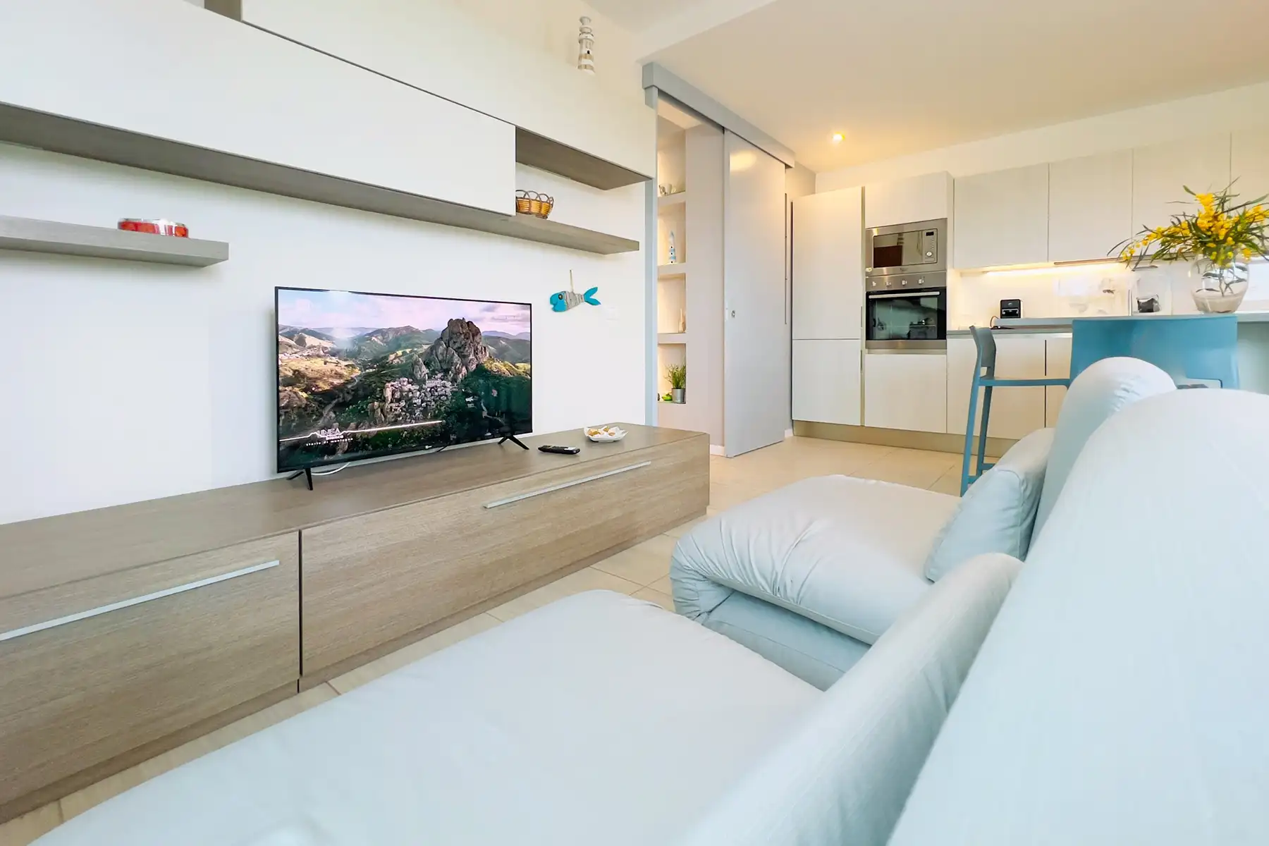 Gli spazi sono ampi e pensati per vivere la vacanza in piena libertà: una cucina attrezzata con penisola, forno tradizionale e microonde, lavastoviglie, macchina per il caffè e tutto il necessario per sentirsi davvero a casa. La zona giorno accoglie un comodo soggiorno con divani e tavolo da pranzo, mentre una seconda area relax offre divano letto matrimoniale e scrivania, ideale anche per chi cerca un angolo tranquillo dove leggere o lavorare. La zona notte è un rifugio di comfort e quiete: una camera matrimoniale spaziosa, con la possibilità di aggiungere due letti a castello apribili per ospitare anche famiglie numerose. A rendere il soggiorno ancora più piacevole, tre Smart TV (due nelle zone giorno e una in camera da letto) con accesso a Netflix e Prime Video, per godersi una pausa di relax dopo una giornata al mare.