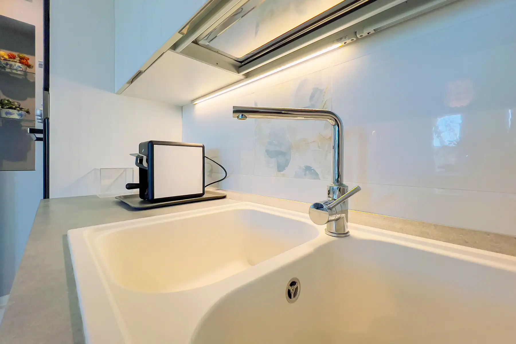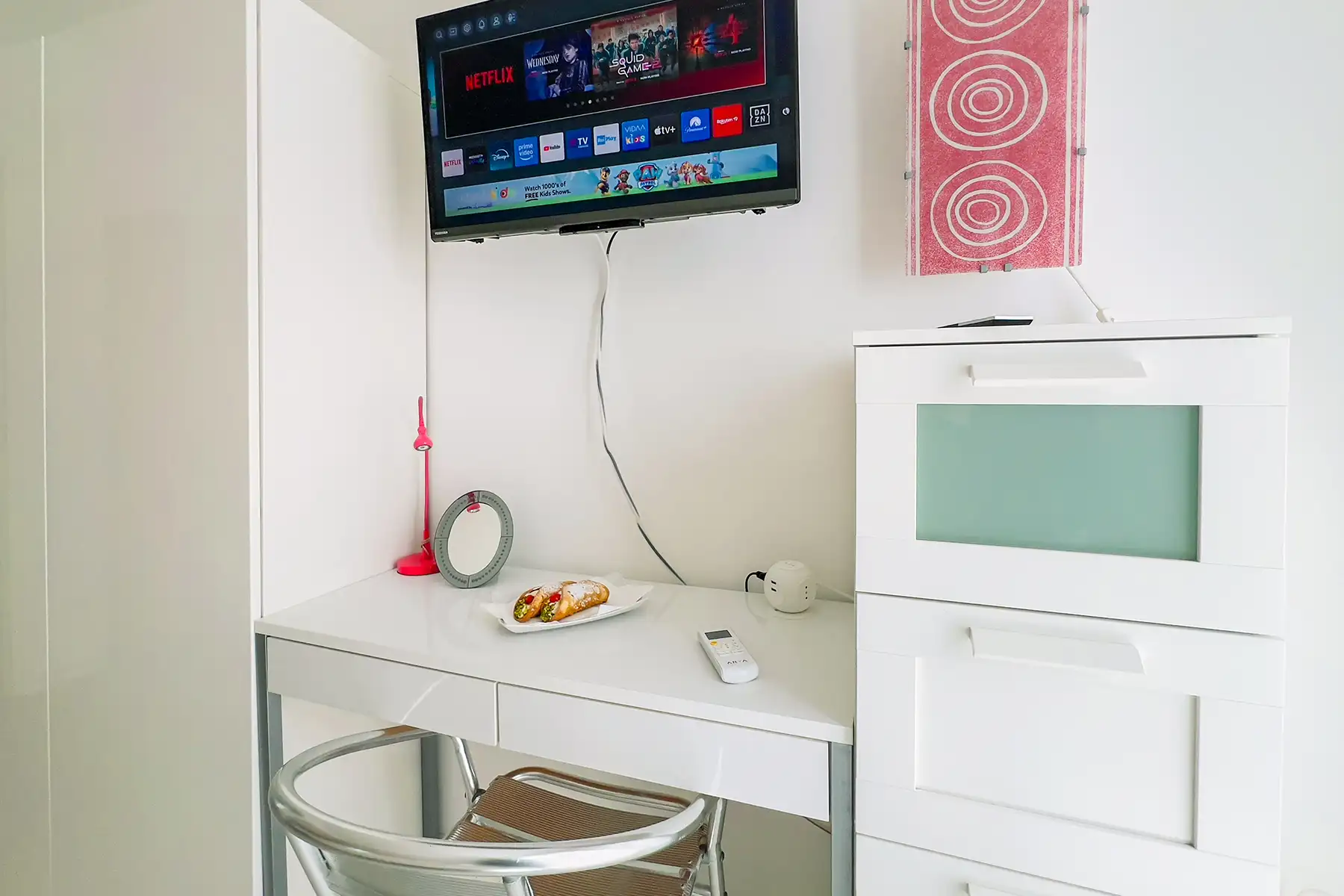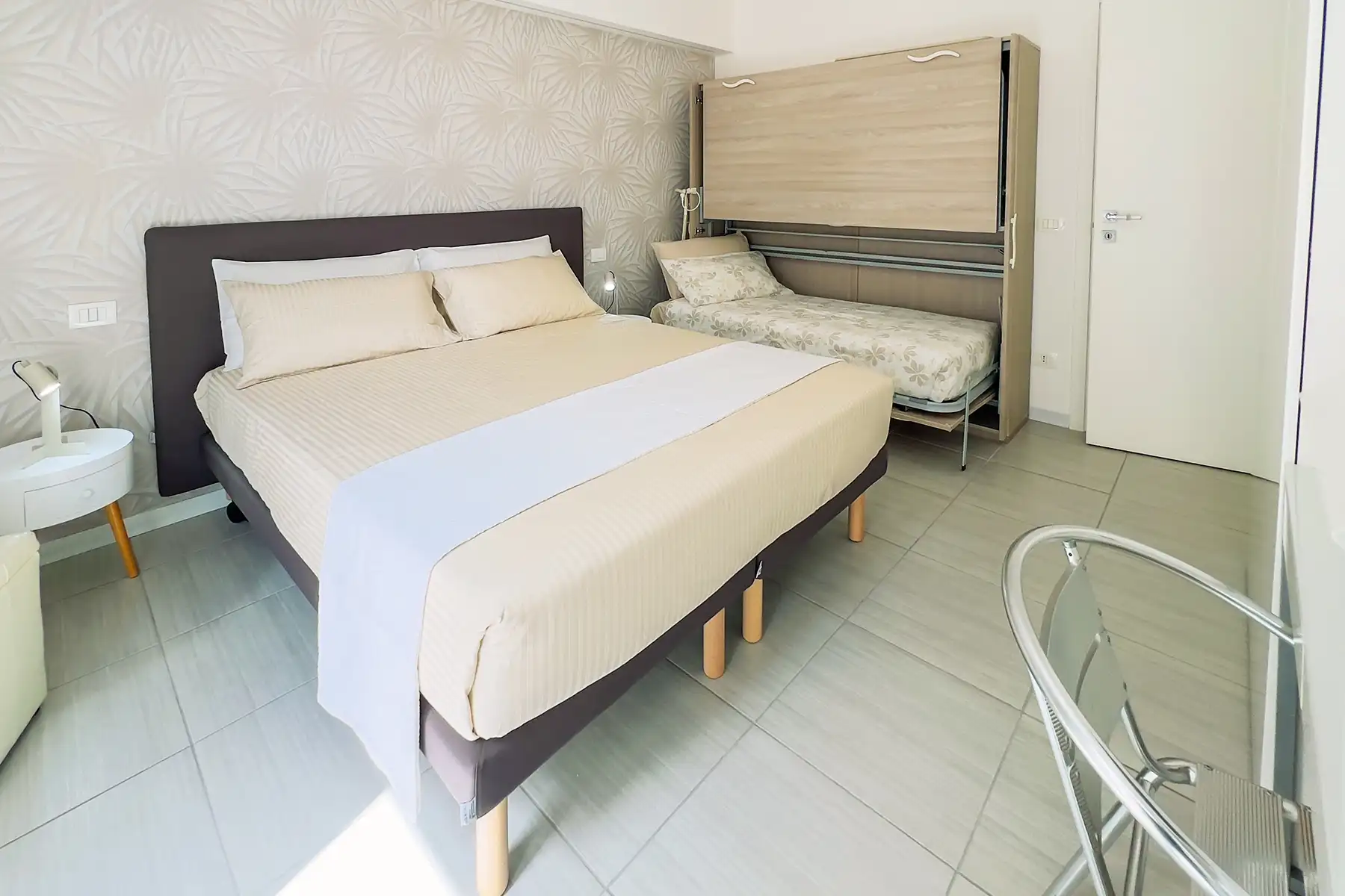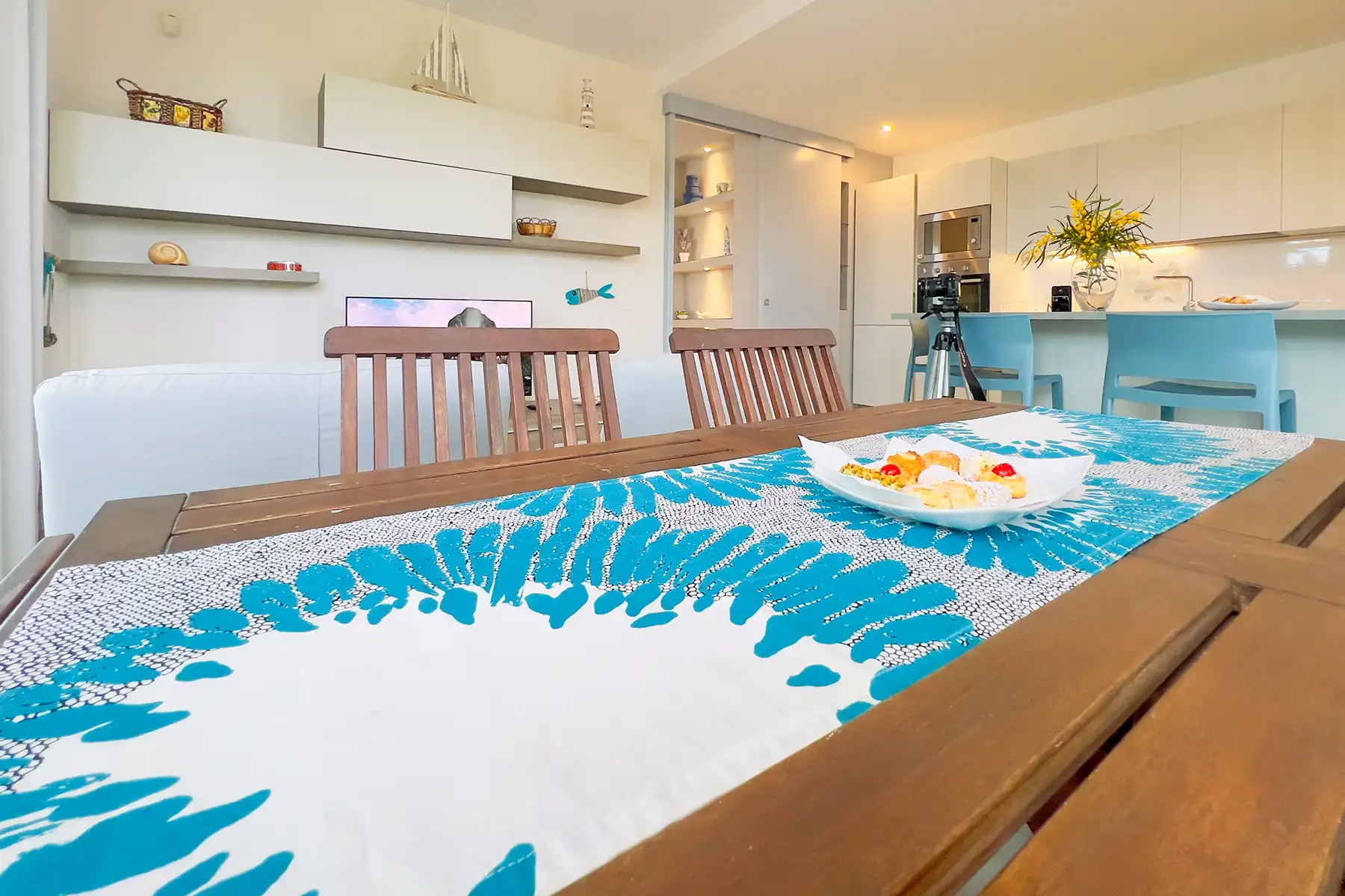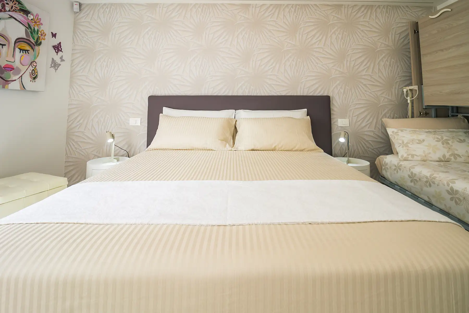 Gli spazi sono ampi e pensati per vivere la vacanza in piena libertà: una cucina attrezzata con penisola, forno tradizionale e microonde, lavastoviglie, macchina per il caffè e tutto il necessario per sentirsi davvero a casa. La zona giorno accoglie un comodo soggiorno con divani e tavolo da pranzo, mentre una seconda area relax offre divano letto matrimoniale e scrivania, ideale anche per chi cerca un angolo tranquillo dove leggere o lavorare. La zona notte è un rifugio di comfort e quiete: una camera matrimoniale spaziosa, con la possibilità di aggiungere due letti a castello apribili per ospitare anche famiglie numerose. A rendere il soggiorno ancora più piacevole, tre Smart TV (due nelle zone giorno e una in camera da letto) con accesso a Netflix e Prime Video, per godersi una pausa di relax dopo una giornata al mare.
