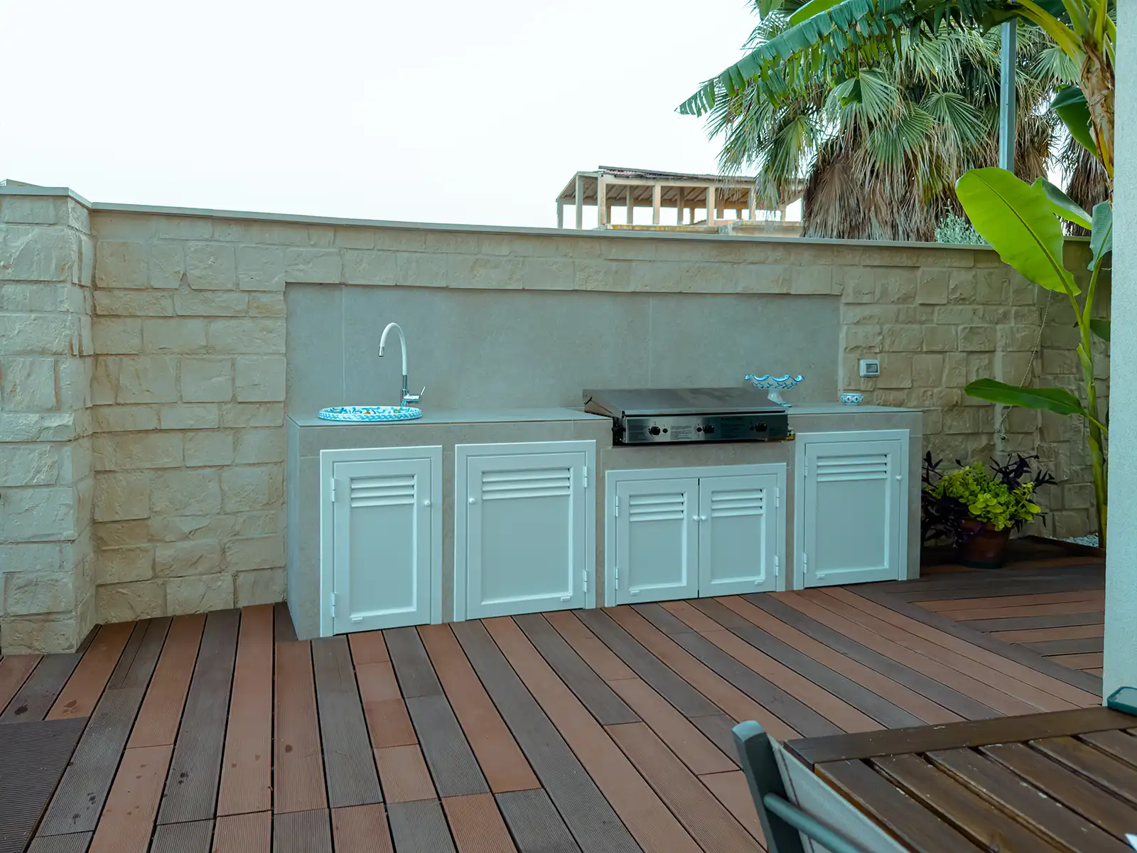 Gli ospiti dell’appartamento Luna di Mare godono di un plus esclusivo rispetto alle camere. A loro è riservata un’area privata fronte appartamento, con solarium, veranda attrezzata con tavolo e sedie per pranzi e cene all’aperto, area barbecue a gas e vasca idromassaggio ad uso esclusivo. Inoltre, possono usufruire anche del bagno esterno con lavatrice riservata e doccia esterna con acqua calda.