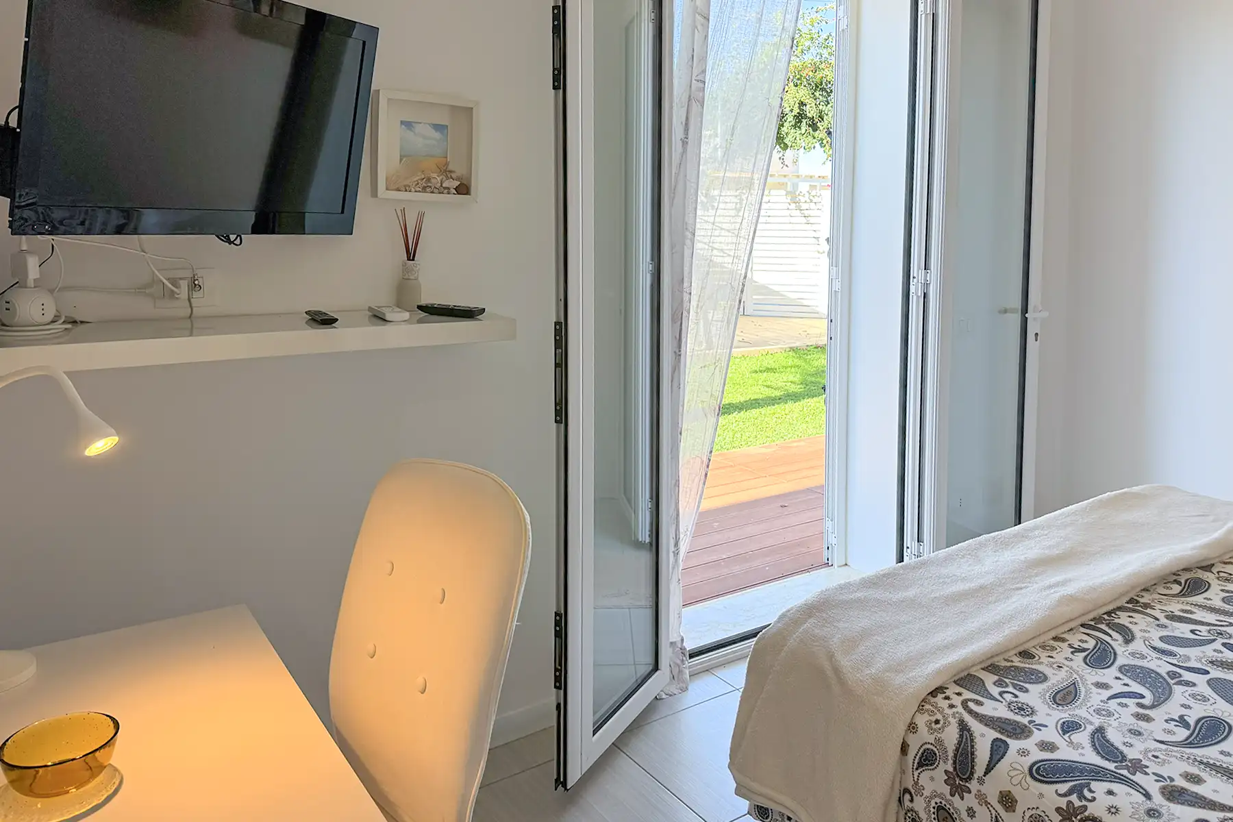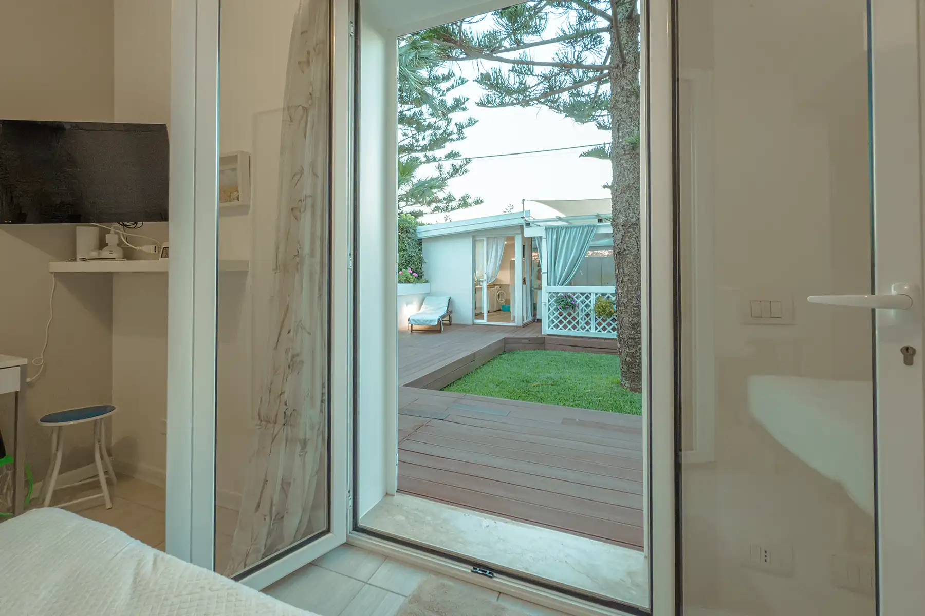 Avvolta dalla brezza del nord-ovest, la camera Maestrale si apre sul giardino con una porta a vetro e profumi mediterranei. Un rifugio intimo e rilassante, dove il tempo rallenta e ogni dettaglio invita al riposo. Pensata per coppie in cerca di silenzio e bellezza, a pochi passi dalle acque cristalline di Santa Maria del Focallo.